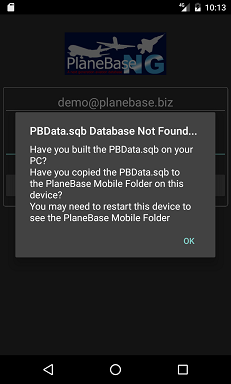 If you see the below error then you have not copied the PBData.sqb to the 'PlaneBase Mobile Folder'