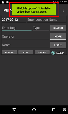 To Update the App, open the about screen and a new 'PBM UPDATE AVAILABLE' button will be available