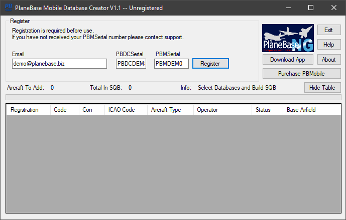 Enter the PBMSerial found in the 'PlaneBase Mobile Details' email sent to you when you registered.