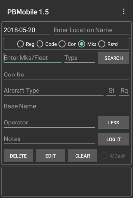 Example2: If you enter 130 in the registration and press search it will show details for aircraft with a reg matching 130 only, if you long press the search button it will find everything that starts with 130.