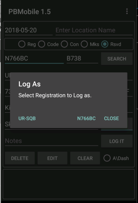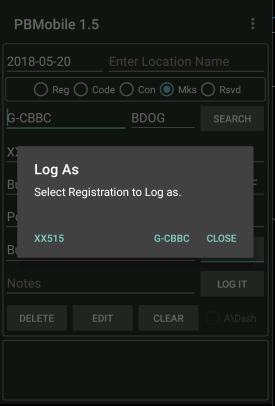 If you want to log as XX515 then long press on the Mks text box in this case XX515 and you will be asked to select the registration you want to log (third image).