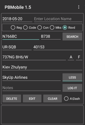 PBMobile's Notes will be updated with the current registration as in PlaneBase for reference. ex: In PB As N766BC
