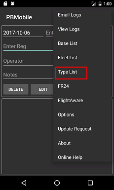The Type List page will now be shown, If you have searched for a registration on the main page then the Type List text box should be populated.