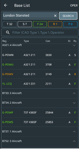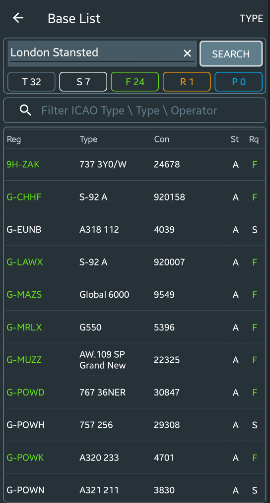 Once you have selected a Base press search and the list will be populated with aircraft who are based at the selected airfield.