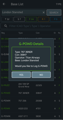 To log an aircraft long press on the row and a pop up box will be shown similar to the below image, press 'Yes' to log it and 'No' to return to the base list screen.