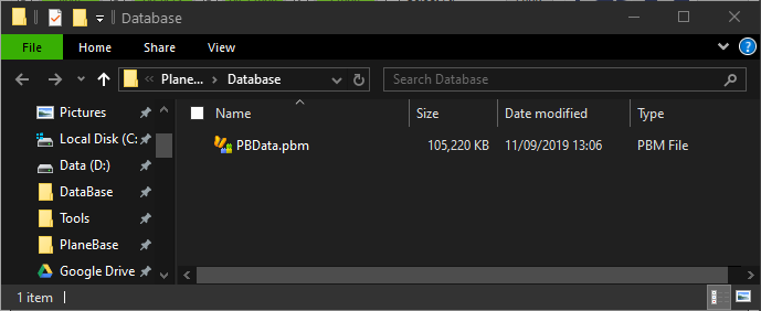 The PBData.pbm can be found in the C:\PlaneBase\PlaneBase Mobile\Database folder.