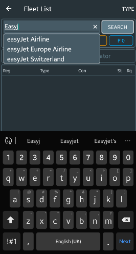 if you Enter 'easyJet' and long press the search button then the list will populate with all aircraft found where the Operator starts with easyJet, so easyJet Airline, easyJet Europe and easyJet Switzerland.