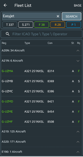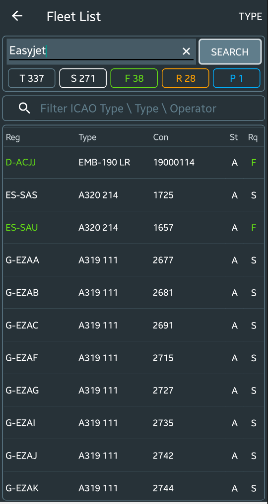 Fleet List allows you to see aircraft in use by the selected Operator.