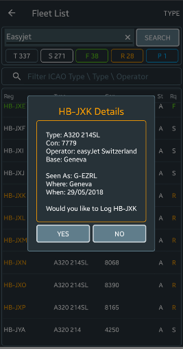 To log an aircraft long press on the row and a pop up box will be shown similar to the below image, press 'Yes' to log it and 'No' to return to the base list screen.