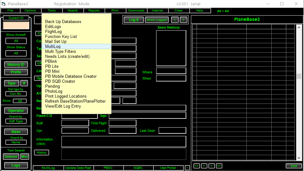 Should ICAO operator codes be displayed in the PBM log, these can be excluded from the Multilog display by selecting 'Exclude PBM ICAO Opr', in which case the full operator name held in PlaneBase will be displayed.