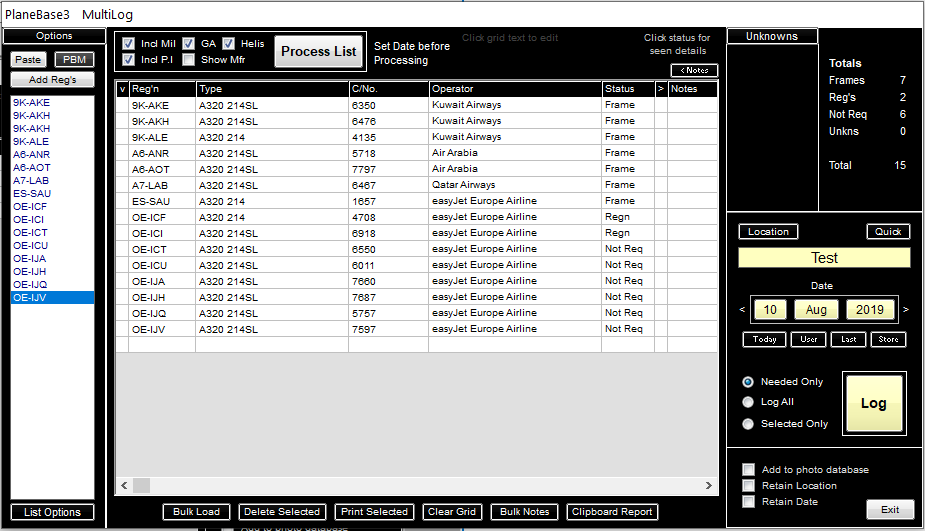 NOTE: Aircraft logged using the Mks or Reserved Registration will not import but will show in the unknowns to the to right of the Multilog window, these will need logging manually.