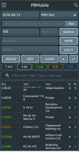 Below i have selected Hex in the search options and entered 43E into the registration box and then long pressed the search button and 417 results are returned.
